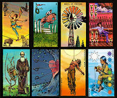 The imagery in this fully illustrated 79-card deck is based on aspects of the End of the American West — an artistic exploration of the standard tarot archetypes restated in Western terms.