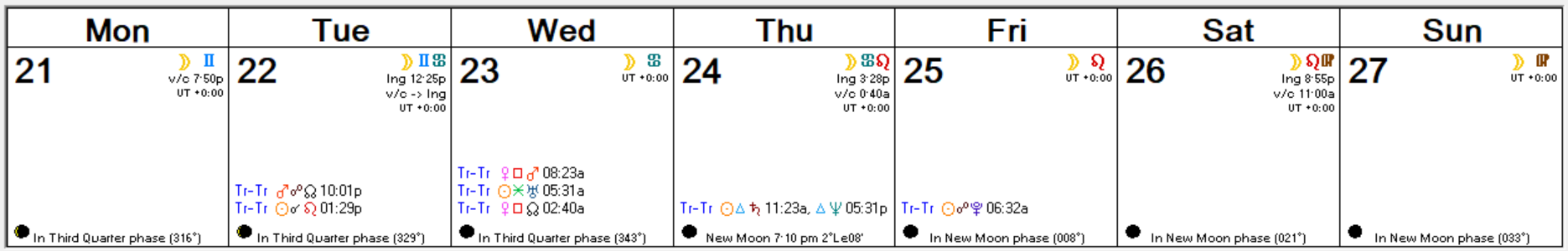 This week starts on Monday with the third quarter (Balsamic) Moon in Gemini, which sextiles Mercury, conjuncts Venus, and squares Mars before the day is through. There are lots of positive aspects associated with the Gemini Moon: insatiable curiosity, for one thing, and playfulness for another. Wit, charm, and charisma for a few more. It’s also good for socializing and interacting with others. Add Mars to the mix and you’re likely to see people running around like chickens with their heads cut off, or talking over one another in casual conversation.