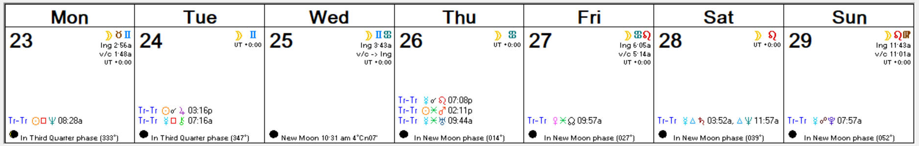 We have a New Moon at 4° Cancer on Wednesday. This takes place at 6:31 EDT (or 10:31 am UT).