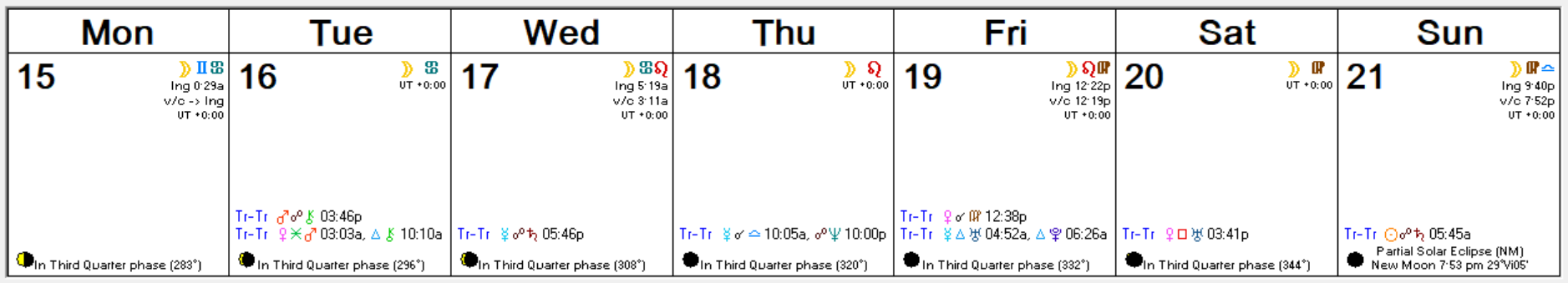 As we wind down the week, on Sunday, there’s a New Moon Solar Eclipse at 29° Virgo 05′. This takes place at 7:53 p.m. UT (or 3:53 p.m. EDT). This is a partial solar eclipse that will be visible in the Southern Hemisphere, including parts of eastern Australia, New Zealand and the South Pacific.